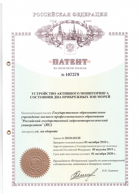 — Патент на изобретение № 107378 «Устройство активного мониторинга состояния дна зон морей» (заявка №2010140126, зарегистрировано в реестре Государственных товарных знаков и знаков обслуживания РФ 1 октября 2010 года)