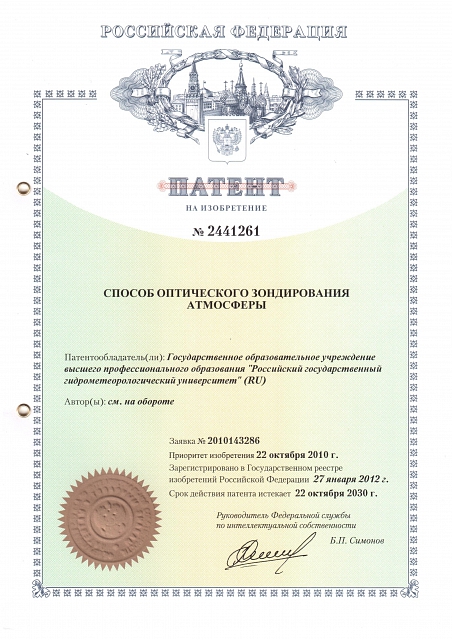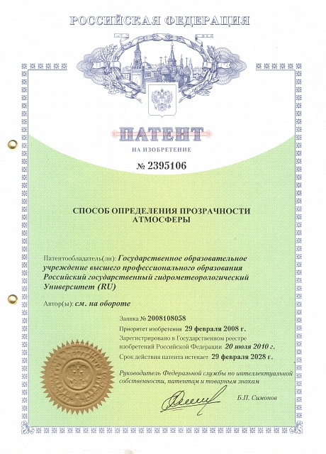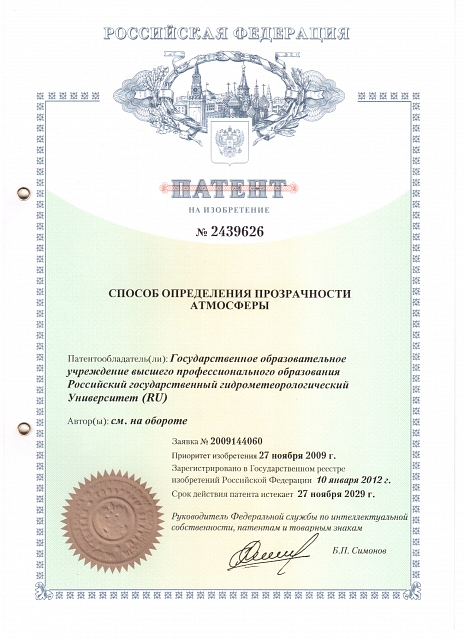 — Патент на изобретение № 2441261 «Способ определения прозрачности атмосферы» (заявка №2010143286, зарегистрировано в реестре Государственных товарных знаков и знаков обслуживания РФ 22 октября 2010 года)