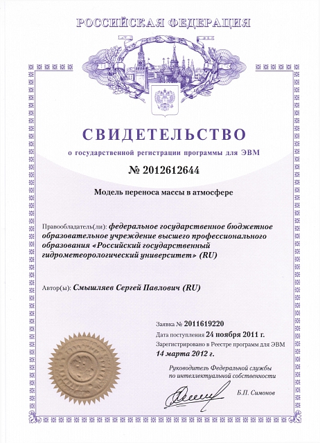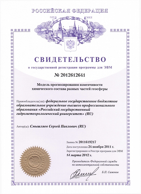 — Свидетельство о государственной регистрации базы данных №2011620129 «База статистических характеристик режима осадков по Северо-Западному региону Российской Федерации» (заявка №2010620783, дата поступления 27 декабря 2010 года, зарегистрировано в реестре баз данных 16 февраля 2011 года) — Свидетельство о государственной регистрации программы для ЭВМ №2012612641 «Модель прогнозирования изменчивости химического состава разных частей геосферы» (автор Смышляев Сергей Павлович, заявка №2011619217, дата поступления 24 ноября 2011 года, зарегистрировано в реестре программ для ЭВМ 14 марта 2012 года) — Свидетельство о государственной регистрации программы для ЭВМ №2012612642 «Модель эволюции атмосферных газовых и аэрозольных примесей в региональном масштабе» (автор Смышляев Сергей Павлович, заявка №2011619218, дата поступления 24 ноября 2011 года, зарегистрировано в реестре программ для ЭВМ 14 марта 2012 года) — Свидетельство о государственной регистрации программы для ЭВМ №2012612643 «Модель химического состава атмосферного воздуха в городских условиях» (автор Смышляев Сергей Павлович, заявка №2011619219, дата поступления 24 ноября 2011 года, зарегистрировано в реестре программ для ЭВМ 14 марта 2012 года) — Свидетельство о государственной регистрации программы для ЭВМ №2012612644 «Модель переноса массы в атмосфере» (автор Смышляев Сергей Павлович, заявка №2011619220, дата поступления 24 ноября 2011 года, зарегистрировано в реестре программ для ЭВМ 14 марта 2012 года)