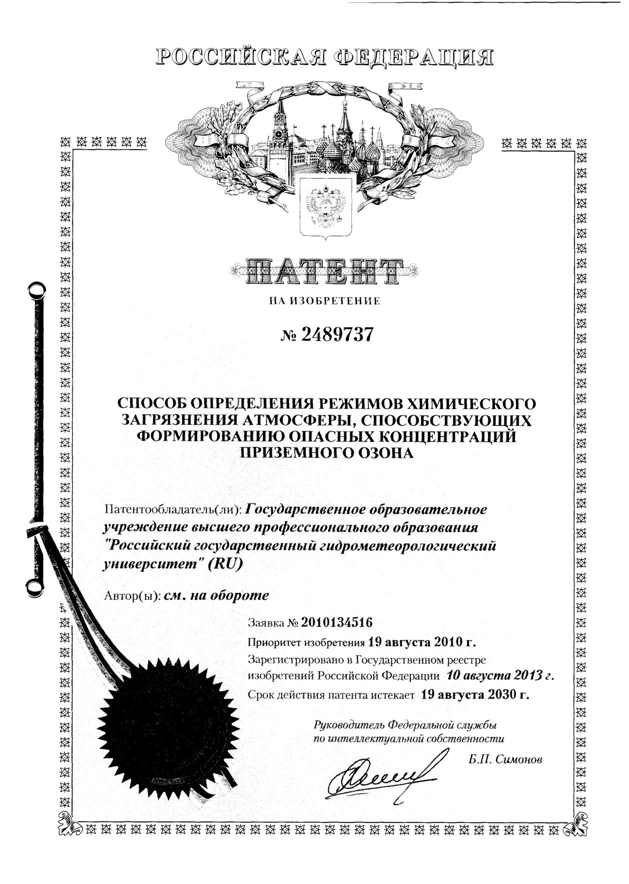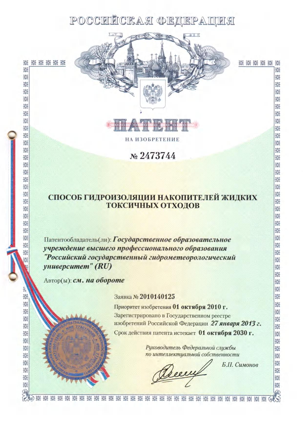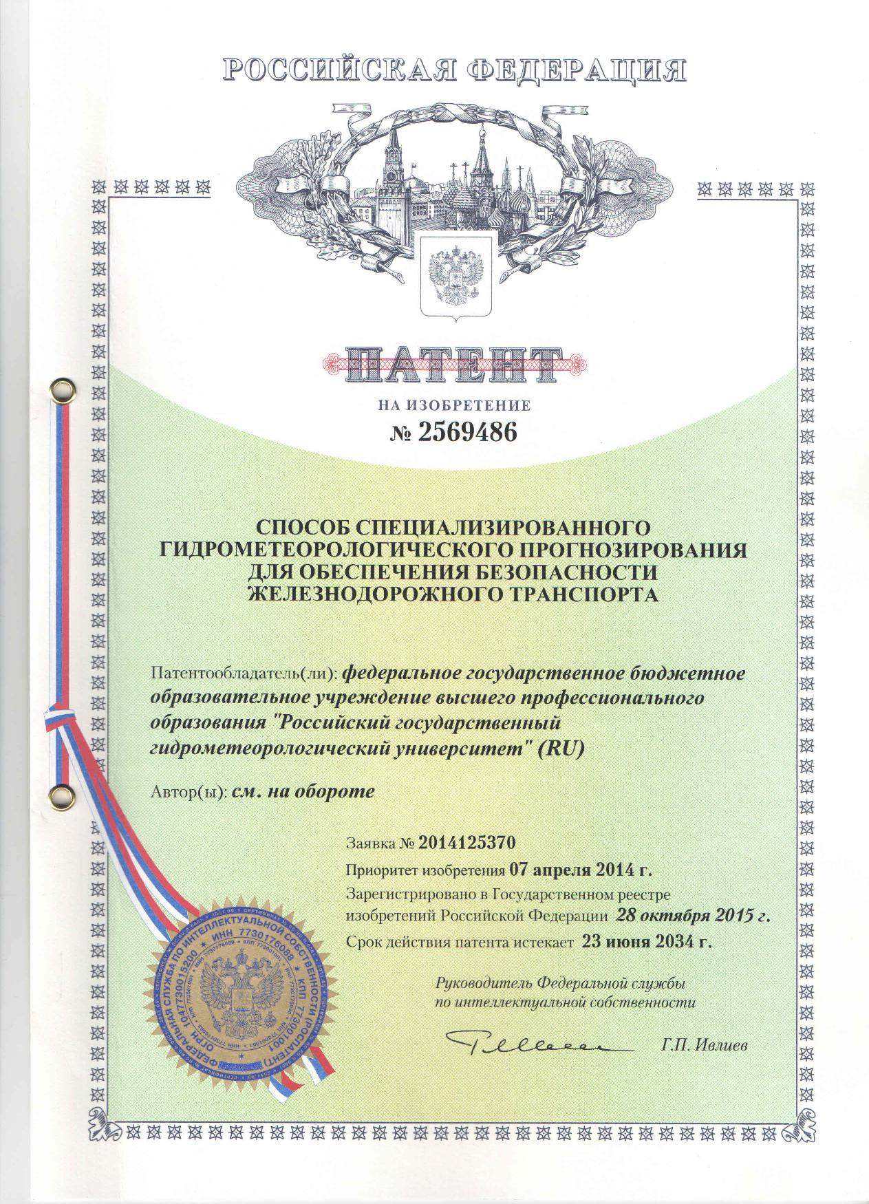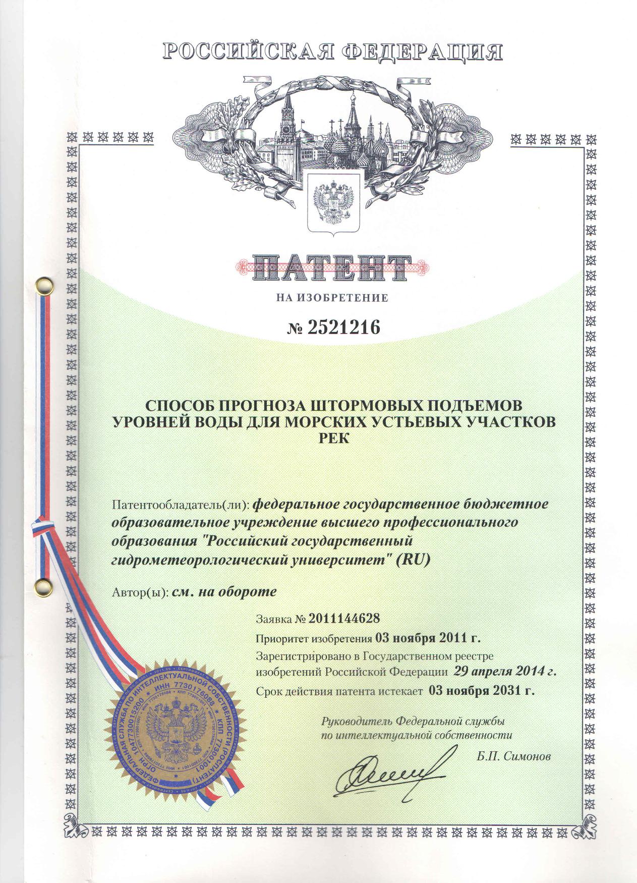 — Патент РФ на изобретение № 2569486 «Способ специализированного гидрометеорологического прогнозирования для обеспечения безопасности железнодорожного транспорта» (заявка № 2014125370, приоритет изобретения 23 июня 2014 года, зарегистрировано в Государственном реестре изобретения Российской Федерации 28 октября 2015 года) — Патент РФ на изобретение № 2522719 «Способ определения зоны влияния продуктов токсичных выбросов свалок» (заявка №2010144158, приоритет изобретения 29 октября 2010 года, зарегистрировано в Государственном реестре изобретения Российской Федерации 21 мая 2014 года) — Патент РФ на изобретение № 2521216 «Способ прогноза штормовых подъемов уровней воды для морских устьевых участков рек» (заявка № 2011144628, приоритет изобретения 03 ноября 2011 года, зарегистрировано в Государственном реестре изобретения Российской Федерации 29 апреля 2014 года) — Патент РФ на изобретение № 2489737 «Способ определения режимов химического загрязнения атмосферы, способствующих формированию опасных концентраций приземного озона» (заявка № 2010134516, приоритет изобретения 19 августа 2010 года, зарегистрировано в Государственном реестре изобретения Российской Федерации 10 августа 2013 года) — Патент РФ на изобретение № 2473744 «Способ гидроизоляции накопителей жидких токсичных отходов» (заявка № 2010140125, приоритет изобретения 01 октября 2010 года, зарегистрировано в Государственном реестре изобретения Российской Федерации 27 января 2013 года) — Патент РФ на изобретение № 2395106 «Способ определения прозрачности атмосферы» (заявка №2008108058, приоритет полезной модели 29 февраля 2008 года, зарегистрировано в Государственном реестре полезных моделей Российской Федерации 20 июля 2010 года) — Патент на изобретение № 2439626 «Способ определения прозрачности атмосферы» (заявка №2009144060, зарегистрировано в реестре Государственных товарных знаков и знаков обслуживания РФ 20 ноября 2009 года)