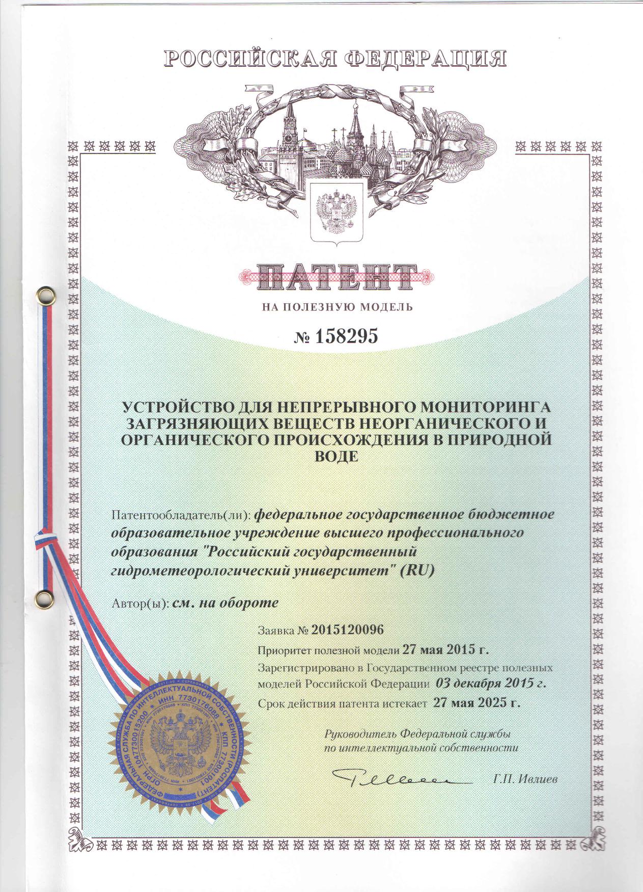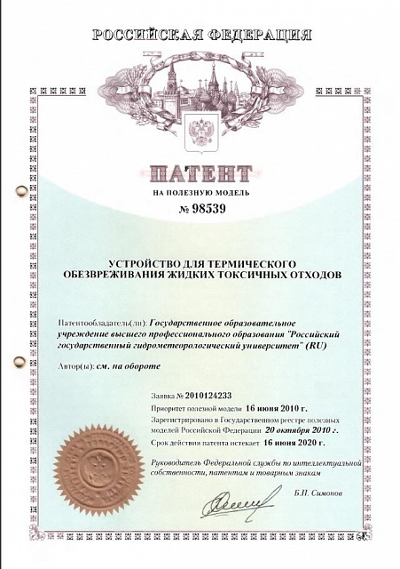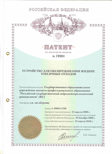 Полезные модели — Патент РФ №158295 «Устройство для непрерывного мониторинга загрязняющих веществ неорганического и органического происхождения в природной воде» (заявка № 2015120096, приоритет полезной модели 27 мая 2015 года, зарегистрировано в Государственном реестре полезных моделей Российской Федерации 03 декабря 2015 года) — Патент РФ №78901 «Устройство для обезвреживания жидких токсичных отходов» (заявка №2008117598, приоритет полезной модели 23 апреля 2008 года, зарегистрировано в Государственном реестре полезных моделей Российской Федерации 10 декабря 2008 года) — Патент РФ №98539 «Устройство для термического обезвреживания жидких токсичных отходов» (заявка №2010124233, приоритет полезной модели 16 июня 2010 года, зарегистрировано в Государственном реестре полезных моделей Российской Федерации 20 октября 2010 года)