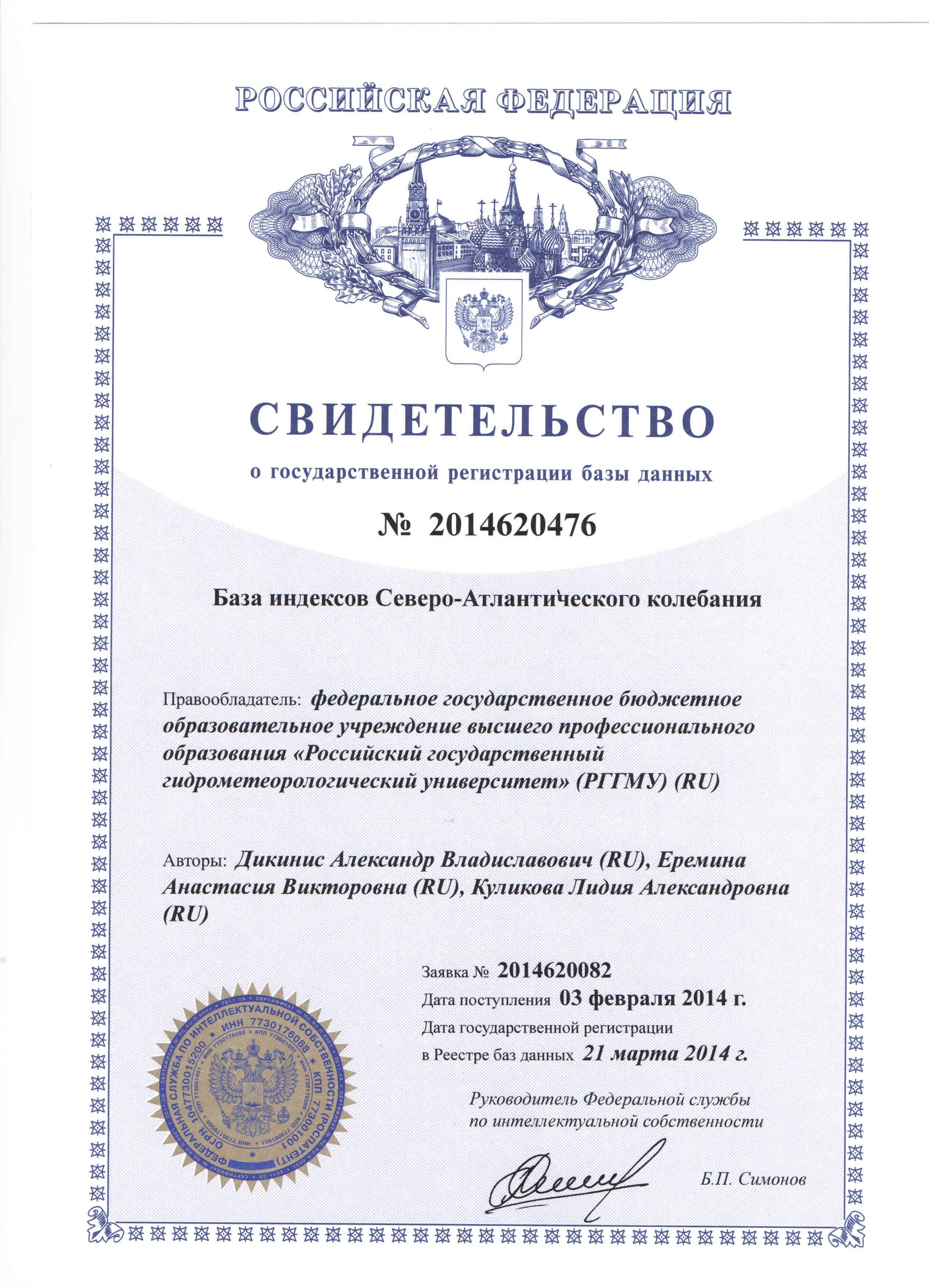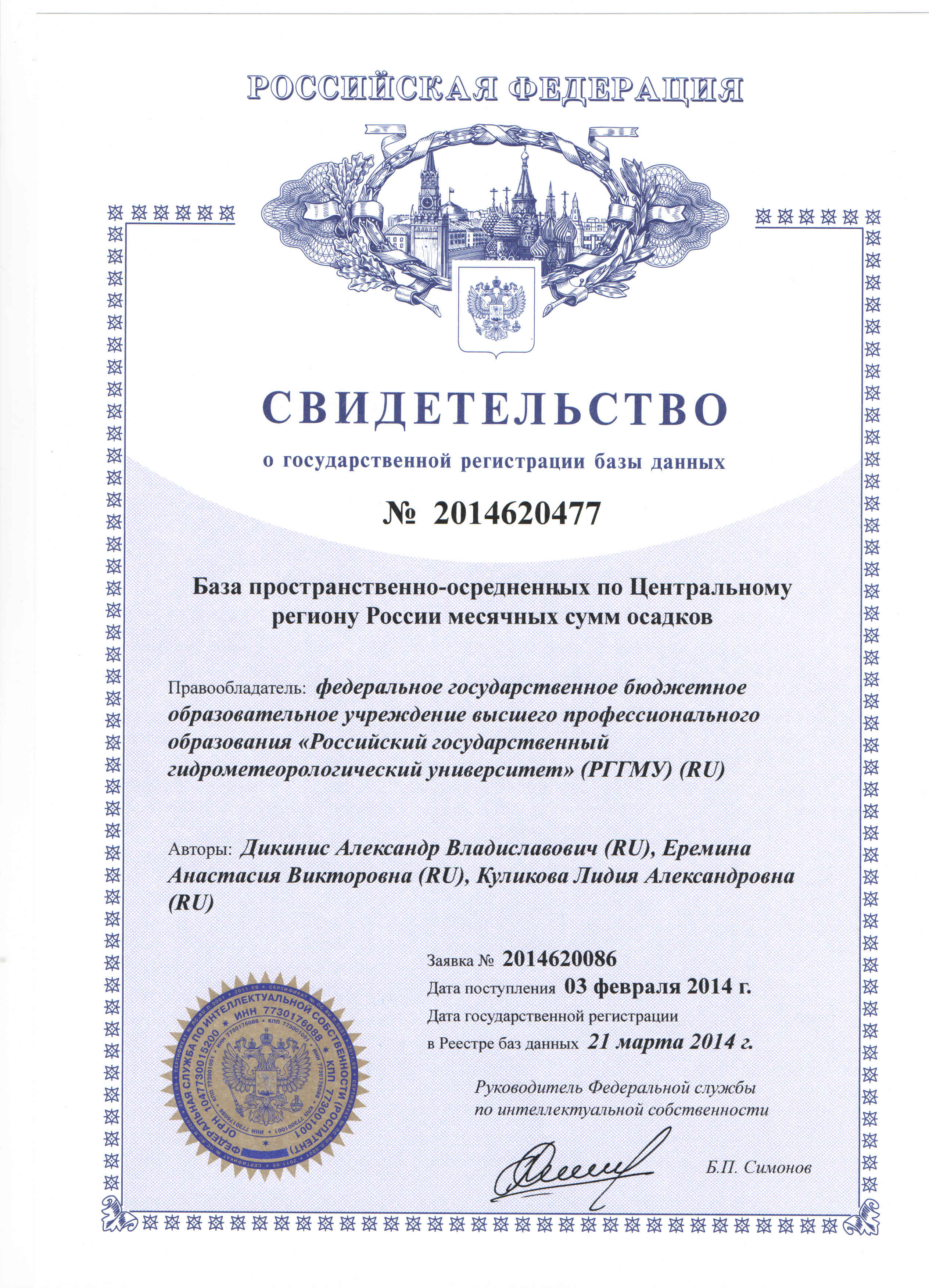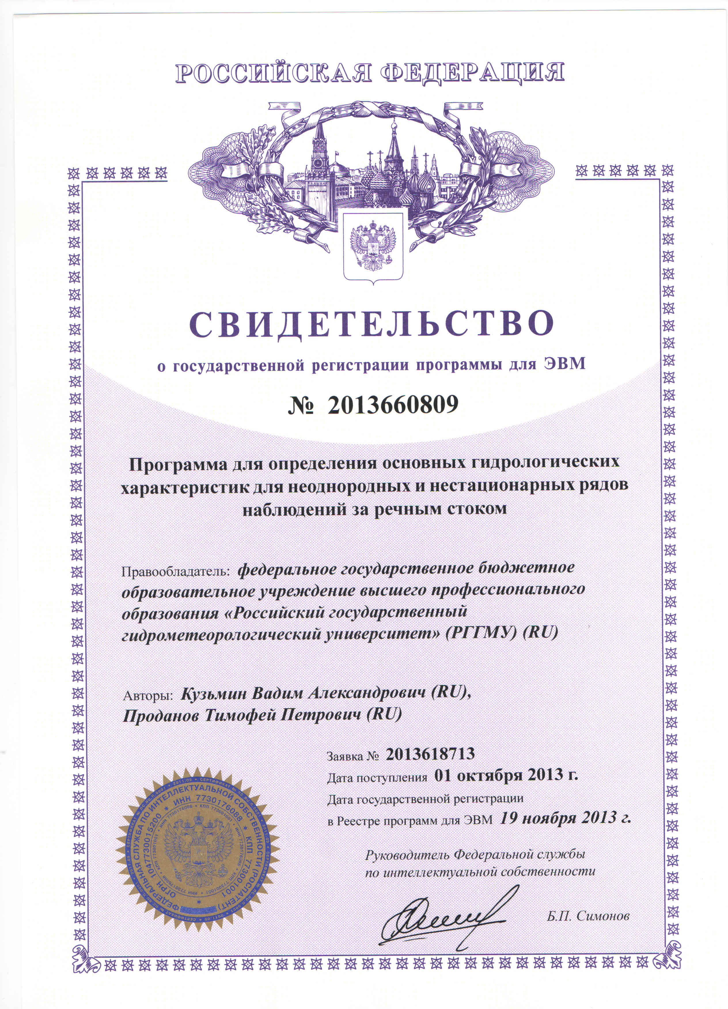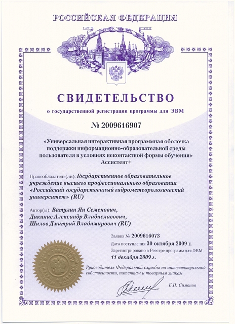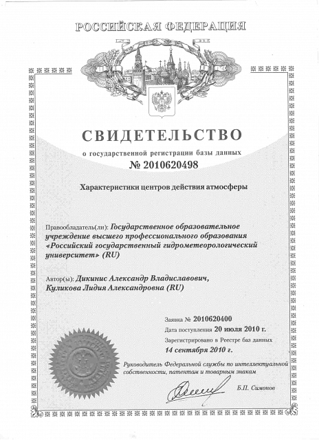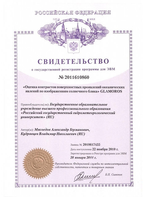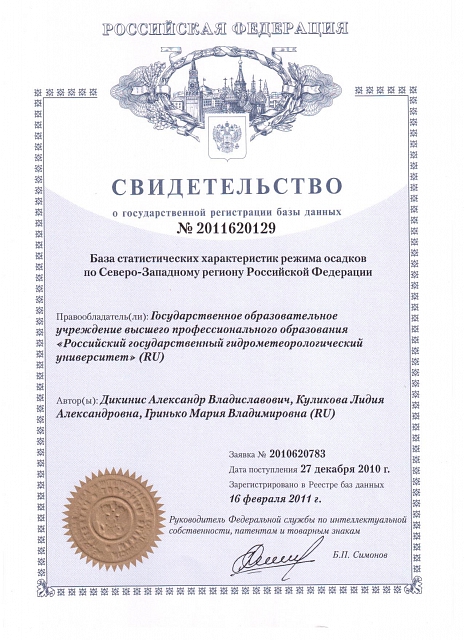— Свидетельство о государственной регистрации программы для ЭВМ № 2016610628 «Программа для обработки радиолокационных данных» (заявка № 2015661166, дата поступления 18 ноября 2015 года, зарегистрировано в реестре программ для ЭВМ 15 января 2016 года) — Свидетельство о государственной регистрации программы для ЭВМ № 2016661009 «Программа мониторинга и прогнозирования гидрометеорологических переменных с применением мезомасштабного моделирования для расчета распределения ливневых стоков по различным бассейнам канализования-ОСАДКИ_МОНИТОРИНГ 1.0 (RainDRain_Monitoring_1.0)» (заявка № 2016618436, дата поступления 02 августа 2016 года, зарегистрировано в реестре программ для ЭВМ 28 сентября 2016 года) — Свидетельство о государственной регистрации программы для ЭВМ № 2016661027 «Программа визуализации в режиме реального времени динамически изменяющейся информации об атмосферных осадках и объемах ливневых стоков по заданным бассейнам, сопутствующих метеорологических данных и технической информации о работе автоматических метеорологических станций - ОСАДКИ_ВИЗУАЛИЗАЦИЯ 1.0 (RainDRain_WebView_1.0)» (заявка № 2016618524, дата поступления 02 августа 2016 года, зарегистрировано в реестре программ для ЭВМ 28 сентября 2016 года) — Свидетельство о государственной регистрации базы данных № 2014620477 «База пространственно-осредненных по Центральному региону России месячных сумм осадков» (заявка № 2014620086, дата поступления 03 февраля 2014 года, зарегистрировано в реестре баз данных 21 марта 2014 года) — Свидетельство о государственной регистрации базы данных № 2014620476 «База индексов Северо-Атлантического колебания» (заявка № 2014620082, дата поступления 03 февраля 2014 года, зарегистрировано в реестре баз данных 21 марта 2014 года) — Свидетельство о государственной регистрации программы для ЭВМ № 2013660809 «Программа для определения основных гидрологических характеристик для неоднородных и нестационарных рядов наблюдений за речным стоком» (заявка № 2013618713, дата поступления 01 октября 2013 года, зарегистрировано в реестре программ для ЭВМ 19 ноября 2013 года) — Свидетельство о государственной регистрации программы для ЭВМ №2009616907 «Универсальная интерактивная программная оболочка поддержки информационно-образовательной среды пользователя в условиях неконтактной формы обучения» Ассистент+ (заявка №2009616701, дата поступления 30 октября 2009 года, зарегистрировано в реестре программ для ЭВМ 11 декабря 2009 года) — Свидетельство о государственной регистрации базы данных №2010620498 «Характеристики центров действия атмосферы» (заявка №2010620400, дата поступления 20 июля 2010 года, зарегистрировано в реестре баз данных 14 сентября 2010 года) — Свидетельство о государственной регистрации программы для ЭВМ №2011610860 «Оценка контрастов поверхностных проявлений океанических явлений по изображениям солнечного блика» GLAMOROS (заявка №2010617455, дата поступления 22 ноября 2010 года, зарегистрировано в реестре программ для ЭВМ 20 января 2011 года)