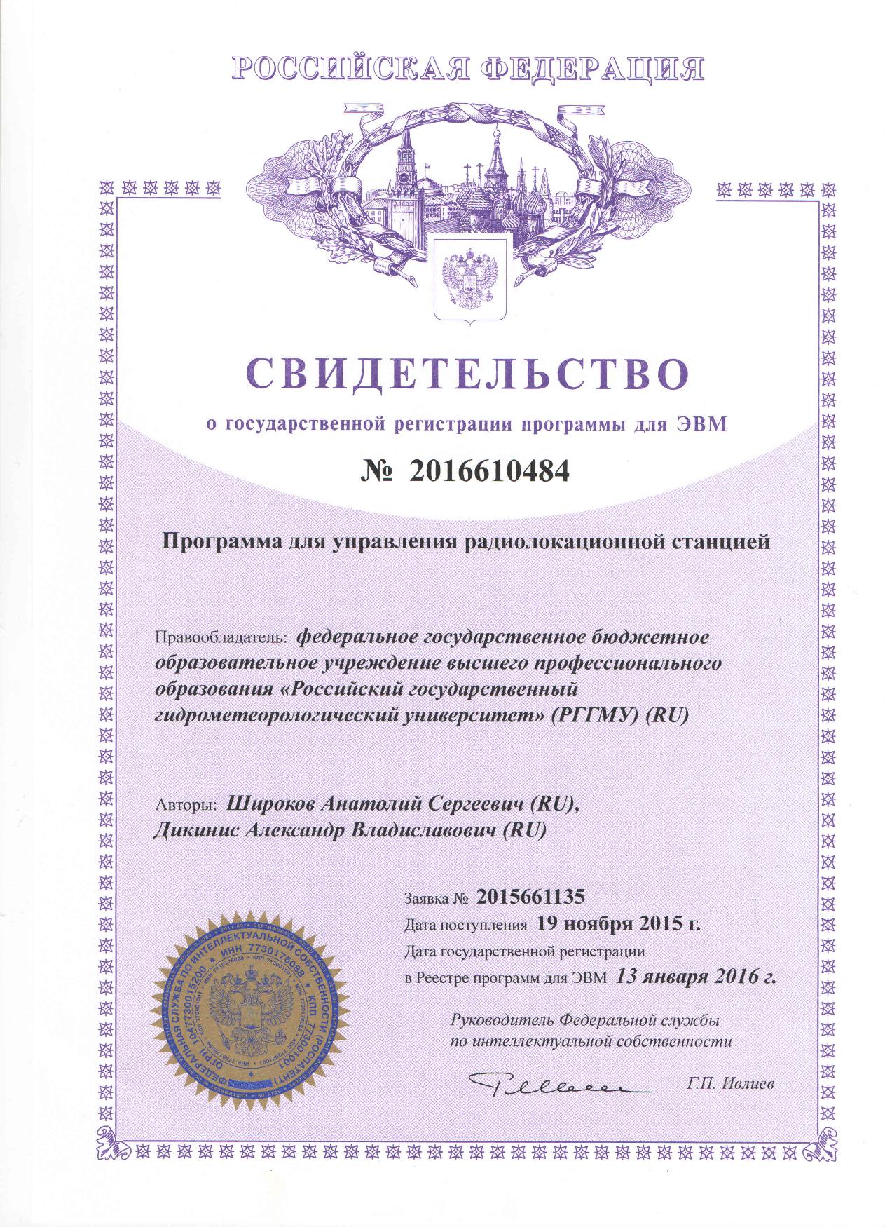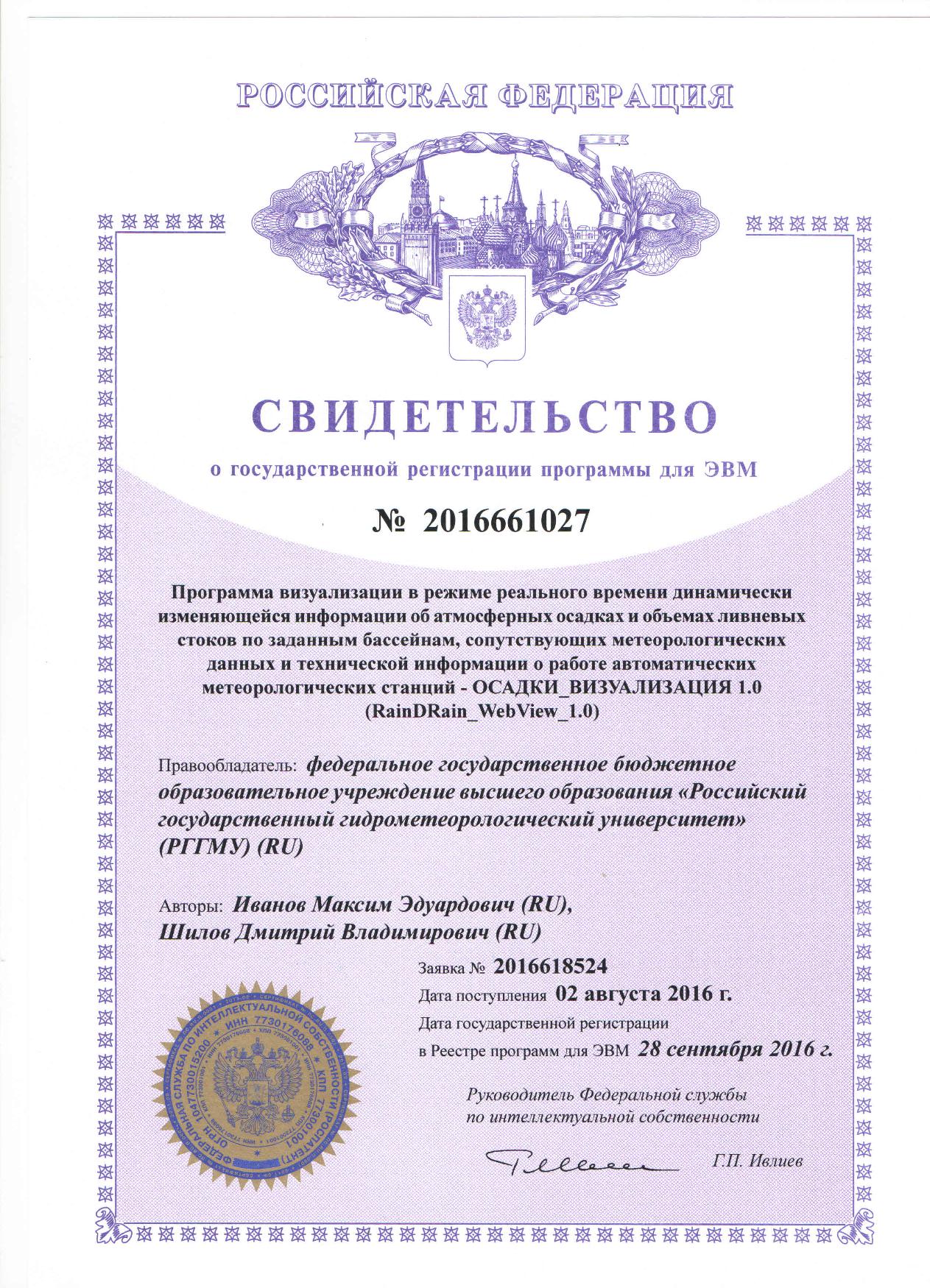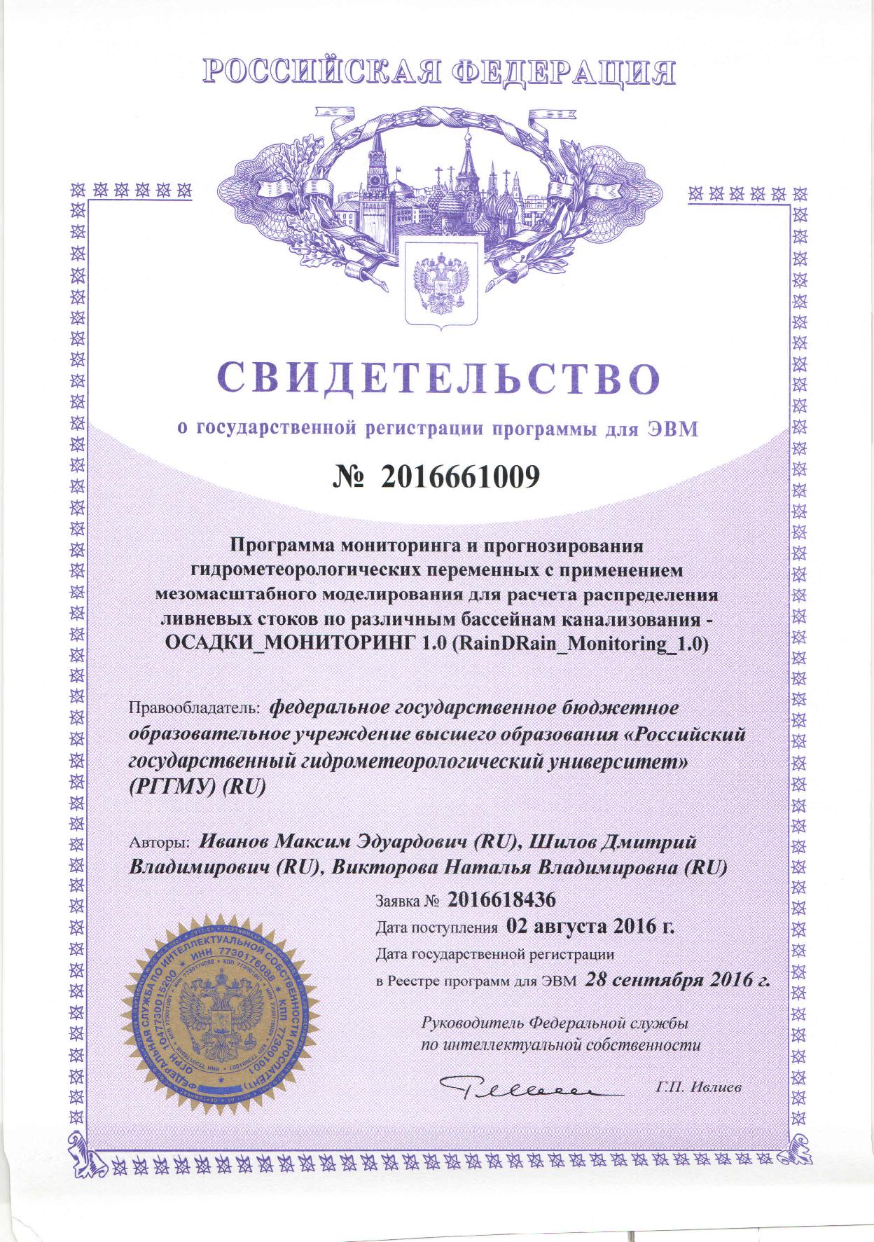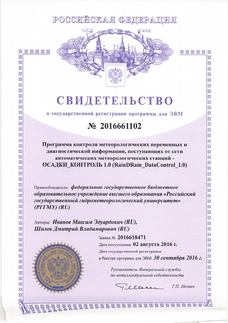 Программы для ЭВМ и базы данных — Свидетельство о государственной регистрации программы для ЭВМ № 2016661102 «Программа контроля метеорологических переменных и диагностической информации, поступающих от сети автоматических метеорологических станций – ОСАДКИ_КОНТРОЛЬ 1.0 (RainDRain_DataControl_1.0)» (заявка № 2016618471, дата поступления 02 августа 2016 года, зарегистрировано в реестре программ для ЭВМ 30 сентября 2016 года) — Свидетельство о государственной регистрации программы для ЭВМ № 2016661103 «Автоматизированная информационная система сбора и обработки информации, поступающей от сети автоматических метеорологических станций, диагноза и прогноза метеорологических параметров, а также объемов ливневых стоков по различным бассейнам канализования для городских систем водоотведения – АИС «ОСАДКИ» 1.0 (RainDRain_System_1.0)» (заявка № 2016618472, дата поступления 02 августа 2016 года, зарегистрировано в реестре программ для ЭВМ 30 сентября 2016 года) — Свидетельство о государственной регистрации программы для ЭВМ № 2016610484 «Программа для управления радиолокационной станцией» (заявка № 20155661135, дата поступления 19 ноября 2015 года, зарегистрировано в реестре программ для ЭВМ 13 января 2016 года)