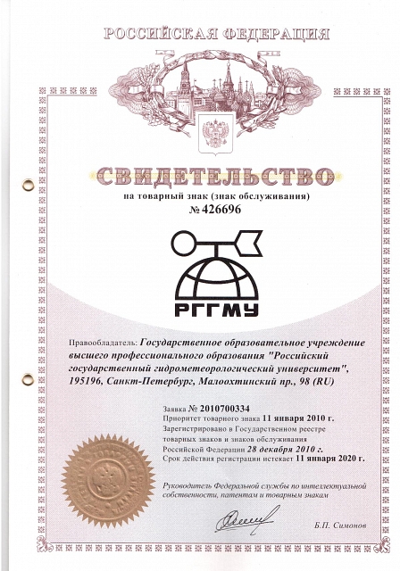 Товарный знак РГГМУ— Свидетельство на товарный знак РГГМУ №426696 (заявка №2010700334, дата поступления 11 января 2010 года, зарегистрировано в реестре Государственных товарных знаков и знаков обслуживаня РФ 28 декабря 2010 года) |